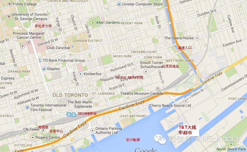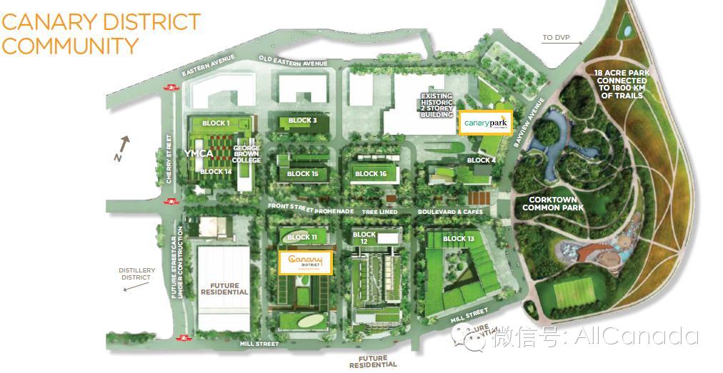 Canary Park 楼盘的东面面对18英亩的Corktown 公园,连接市中心最美风景的休闲通道,可以步行到82000平方尺的YMCA娱乐中心,3分钟车程到现有的T&T大统华超市, Loblaws 西人超市, ST. Lawrence Market,仅1分钟左右就可以开车上多伦多最美的DON VALLY 高速公路通往北部城市,并链接东西向的401高速公路。附近的汤姆森半岛公园更是您夏季休闲的好去处。