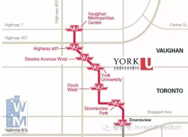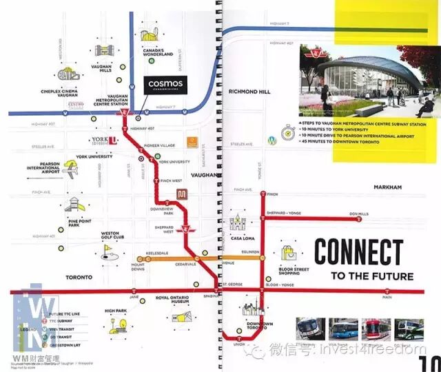地铁延长线,公交服务包括VIVA和YRT。VMC的公共交通系统可直接通往多伦多市的金融,娱乐和医疗设施中心。约克大学位于Jane/Steeles的校园,距VMC仅1公里,而Cosmos Condos与VMC地铁站近在咫尺。