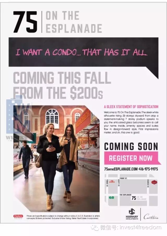 currently in preconstruction at 75 The Esplanade, Toronto. Sales for available units start from the $200,000’s. The development has a total of 350 units.