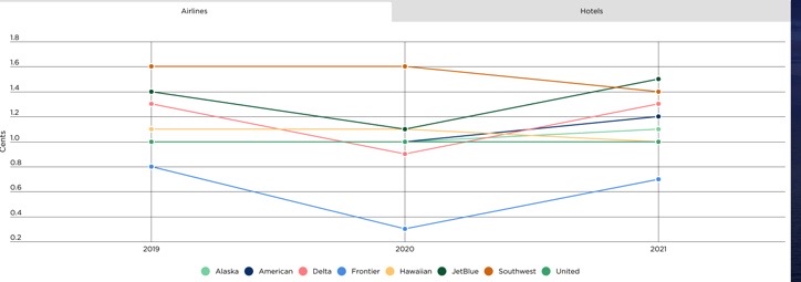 达美航空和捷蓝航空的忠诚会员可以从 COVID-19 大流行中获得比以前更多的宝贵里程。它们的价值分别攀升至 每英里1.3 美分和 1美分,超过了 2021 年每英里 1.2 美分的平均值,并且超过了联合航空和美国航空等传统航空公司的竞争对手。