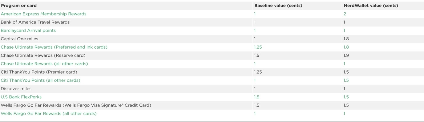 由于可转让信用卡积分比标准旅行奖励更复杂且价值范围更广,因此我们为每个计划或卡提供两个不同的价值: