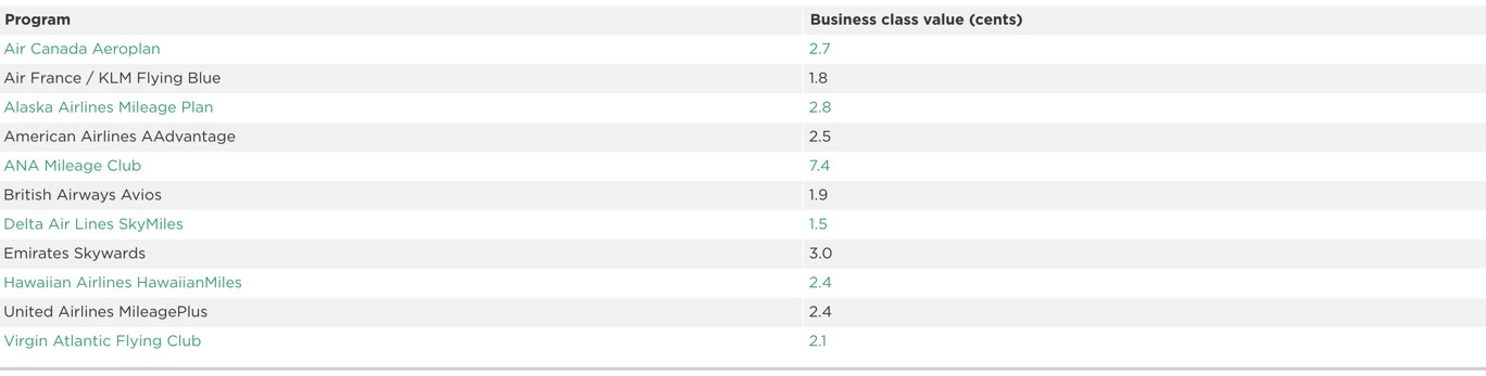 全日空在这方面是明显的佼佼者,在预订商务舱机票时,每英里的价值高达 7.4 美分。达美航空则处于另一端,在预订商务舱而非经济舱时提供的价值仅略高。